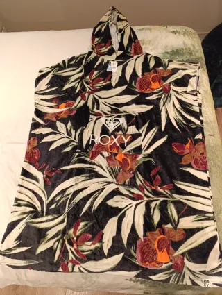 Toalla tipo poncho de la marca Roxy con un llamativo estampado floral. - Diseño con capucha. - Tejido suave y confortable. - Estampado multicolor sobre fondo negro.