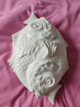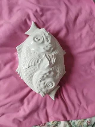 Preciosa fuente decorativa, tapa con forma de dos peces entrelazados. Fabricada en Portugal. Caldas da Rainha. - Mide exterior 40x28x15 cm - Diseño original. - Antigua, Vintage. - Ideal para servir o decorar. - Medida por el interior 30x20 cm. *Está quebrada, rota y pegada como se puede ver en fotos. No tiene otro daño.