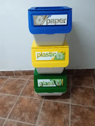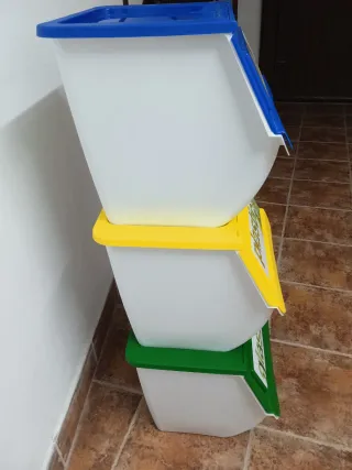 Set de tres contenedores de reciclaje apilables, cada uno con una tapa de color diferente para identificar el tipo de residuo. - Contenedor superior azul para papel. - Contenedor intermedio amarillo para plástico. - Contenedor inferior verde para vidrio.