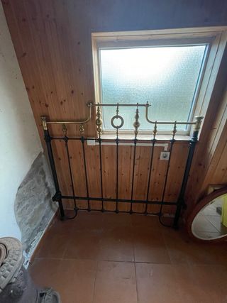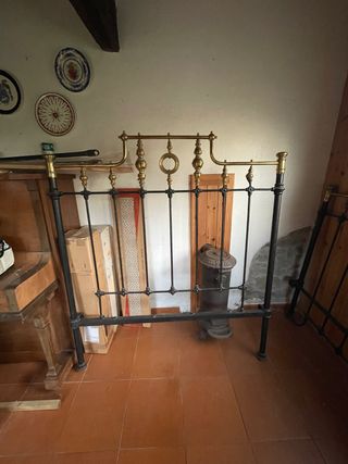 Conjunto de dos cabeceros de forja con detalles en latón. Para cama 90-100cm. Añaden un toque clásico a cualquier habitación. - Diseño con barrotes verticales. - Elementos decorativos circulares en la parte superior. - Acabado en negro y dorado. Alguna parte con desperfectos como se muestra en la fotografia. Precio por los dos 50€.