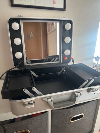 Tocador de maquillaje profesional de Salvador Bachiller con espejo y luces. - Espejo con luces integradas. - Compartimentos interiores para organización. - Diseño elegante y funcional. Tiene algunos desperfectos que señalo en las fotos (no incluye el maquillaje)