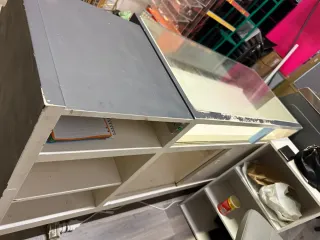 Mostrador para tienda con diseño moderno y funcional. - Superficie superior de cristal. - Estructura principal de madera. - Compartimentos de almacenamiento abiertos.