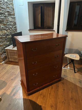 Elegante cómoda antigua con un diseño clásico. - Cuatro cajones amplios. - Tiradores dorados. - Acabado pulido.
