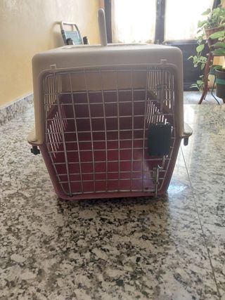 Transportín para mascotas pequeñas, ideal para viajes. Es ligero y fácil de transportar. - Perfecto para gatos o perros pequeños. - Diseño en tonos beige y rosa. - Tiene asa para facilitar su transporte.