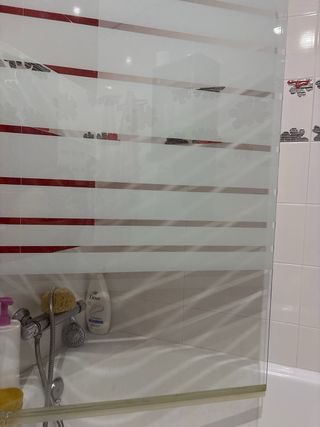 Mampara de bañera con diseño de líneas . - Diseño con franjas horizontales blancas. - Acabado en cristal.