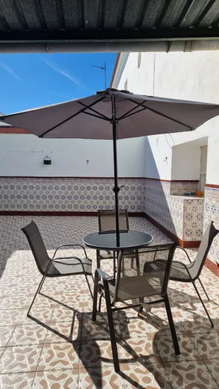 Mesa y 4 sillas exterior con sombrilla