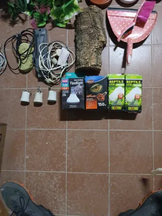 Lote de accesorios variados para terrario. - Plantas artificiales decorativas. - Tronco de corteza. - Comederos y bebederos. - Bombillas para terrario. - Cable calentador y piedra calefactora. - Escobilla y recogedor. - Casquillos ceramicos