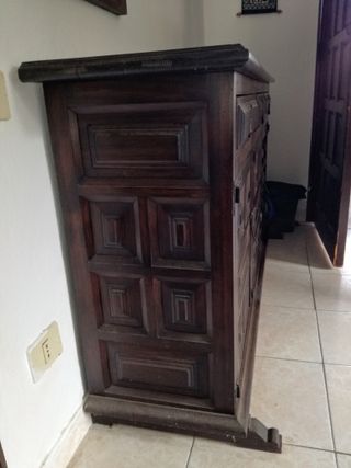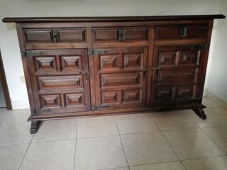 Mueble auxiliar de estilo castellano, con un diseño robusto y tradicional. - Fabricado en madera maciza. - Acabado en tono oscuro. - Puertas y cajones con herrajes ornamentales. - Patas con diseño clásico.