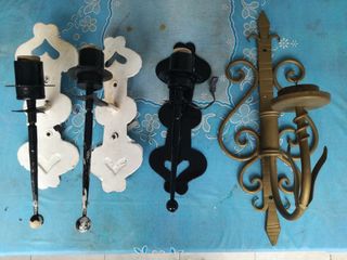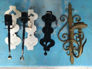 Conjunto de cuatro apliques para pared, ideales para velas. - Diseño clásico con detalles ornamentales. - Acabado en metal. - Incluye apliques en color blanco, negro y dorado.