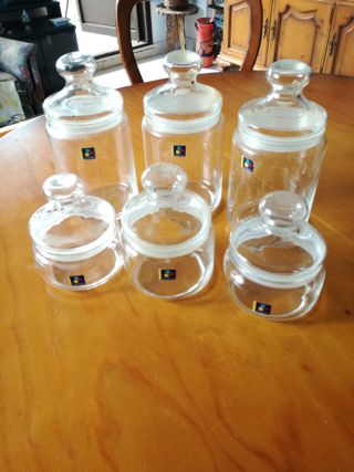 Conjunto de seis frascos de vidrio, perfectos para organizar tu cocina. - Material: Vidrio transparente. - Tapas con cierre hermético. - Diseño clásico y funcional.