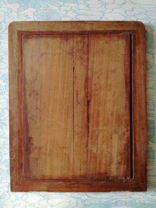 Detalle de puerta de mueble con un grabado artesanal. - Diseño circular con perfil de hombre. - Adornos florales en las esquinas. - Cerradura metálica en la parte superior.