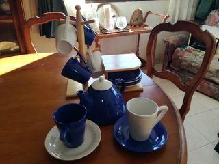 Conjunto de vajilla de cerámica con un diseño elegante en azul y blanco. - Incluye tetera y seis tazas. - Soporte de madera para tazas.