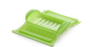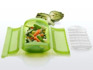 Práctico estuche para cocinar al vapor en el microondas, con bandeja. - Fabricado en plástico. - Color verde y transparente.