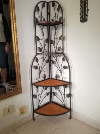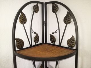 Elegante estantería de esquina con un diseño inspirado en la naturaleza. - Estructura metálica con detalles de hojas. - Estantes de madera con acabado rústico. - Ideal para colocar plantas o elementos decorativos.