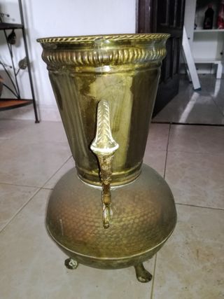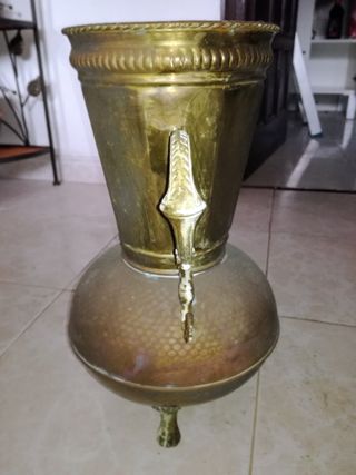Elegante florero de metal con un acabado dorado. Su diseño único lo convierte en una pieza decorativa. - Material: Metal - Color: Dorado - Diseño con base esférica y cuerpo superior cónico - Detalles ornamentales en el asa y borde superior