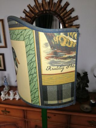 Lámpara de lectura de pie con un diseño único y llamativo. - Pantalla con estampado de pato y motivos geométricos. - Base y estructura en color verde.