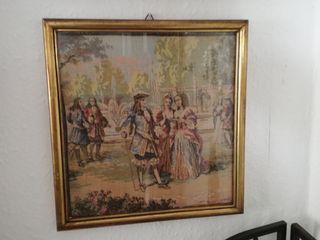 Conjunto de dos pinturas sobre tela, cada una con un marco. - Marco de madera con acabado dorado. - Diseño multicolor en las telas.