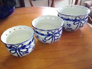 Conjunto de tres jarrones decorativos con un diseño clásico. - Elaborados en cerámica. - Combinación de colores azul y blanco. - Cada jarrón presenta un patrón de lazos y flores. - Borde superior con pequeños detalles calados en forma de corazón.