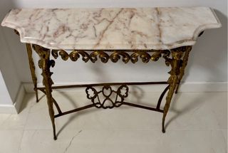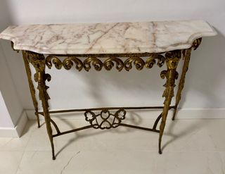 Elegante mesa consola antigua con una superficie de mármol veteado y una estructura de bronce ornamentada. Sus patas metálicas presentan un diseño detallado, aportando un toque clásico y sofisticado. - Medidas: 105 cm de ancho x 75 cm de alto x 31 cm de profundidad. - Acabado dorado en la estructura metálica. - Encimera de mármol con vetas naturales.