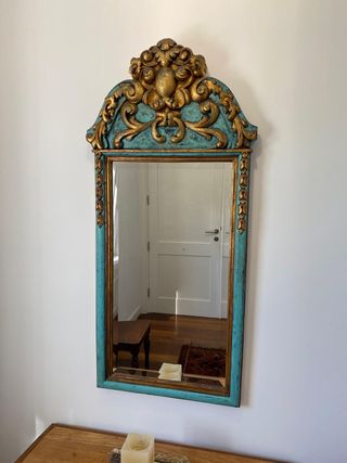 Elegante espejo decorativo con marco ornamentado. - Marco con detalles dorados y acabado turquesa. - Diseño con ornamentación superior. - Cristal de espejo.