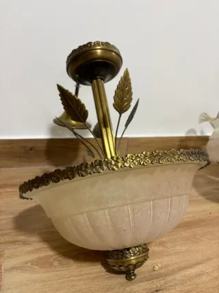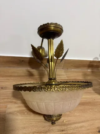 Elegante lámpara de techo con detalles ornamentales. - Estructura principal en metal dorado. - Tulipa de cristal translúcido con diseño acanalado. - Adorno floral en el borde superior de la tulipa. - Base de montaje con detalles decorativos.