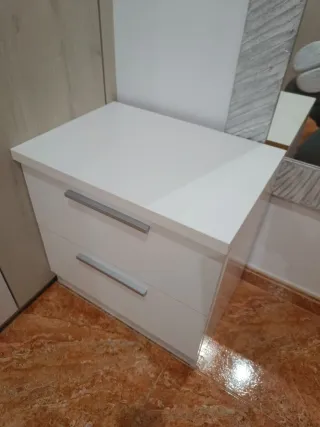 Mesita de noche moderna y funcional. - Diseño elegante y minimalista. - Dos cajones amplios para almacenamiento. - Tiradores metálicos integrados.