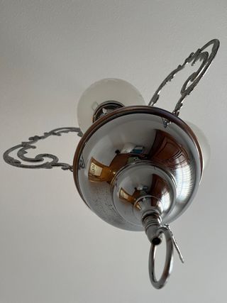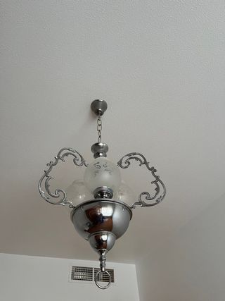 Elegante lámpara de araña con un diseño clásico y detalles ornamentales. - Estructura principal en tono dorado. - Tulipas de cristal transparente con acabado acanalado. - Adorno superior con forma de lira y una pequeña campana.