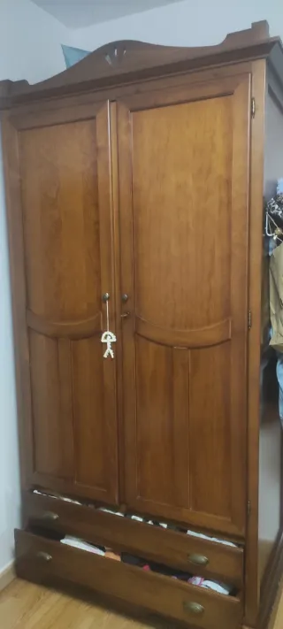 Armario de madera con un diseño clásico y elegante. Cuenta con dos puertas y dos cajones en la parte inferior. Totalmente de madera como nuevo - Tiradores metálicos en los cajones. - Adorno decorativo en la parte superior.