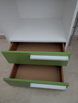 Escritorio juvenil con un diseño moderno y funcional. Estructura principal en color blanco y cajones frontales en color verde.