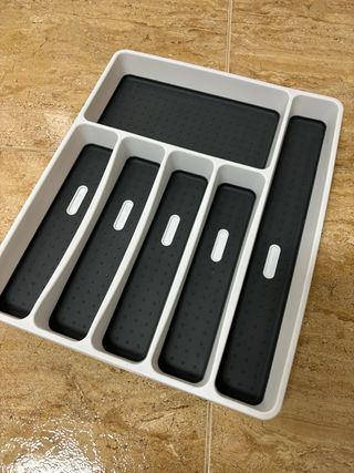 Organizador de cubiertos con compartimentos para mantener tu cajón ordenado. - Diseño moderno en blanco y negro. - Materiales duraderos y fáciles de limpiar.