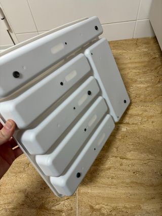 Soporte de pared para platos. - Fabricado en aluminio y plástico. - Diseño vertical con múltiples soportes.
