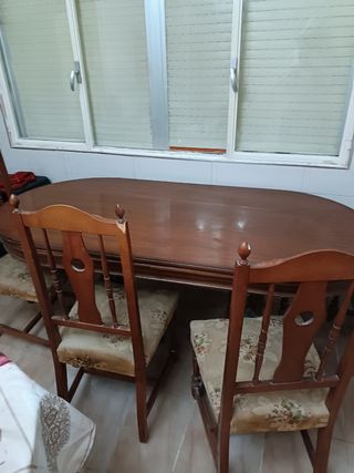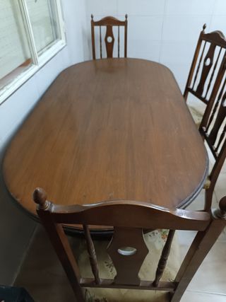 Conjunto de mesa de comedor ovalada y cinco sillas a juego. Ideal para compartir comidas en familia. - Mesa de madera con acabado natural. - Sillas con respaldo calado y asiento tapizado.