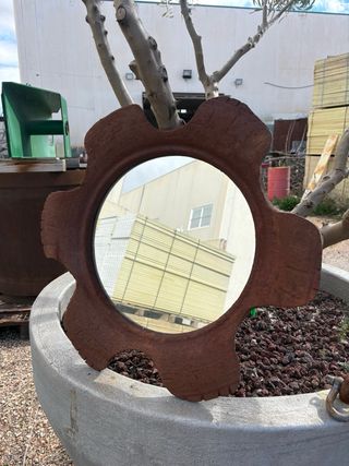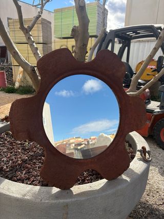 Espejo decorativo con un marco único con acabado en óxido de hierro. - Marco con diseño de engranaje. - Acabado rústico y moderno.