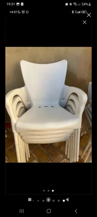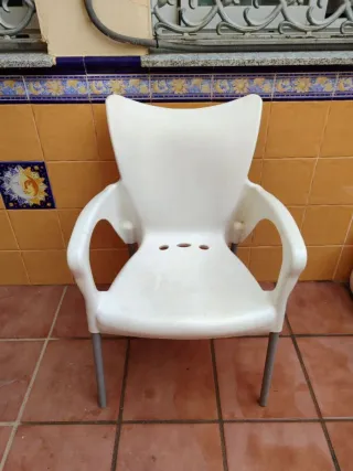 Conjunto de sillas de PVC blancas, perfectas para exteriores o interiores. Son apilables para un fácil almacenamiento. - Diseño moderno y ligero. - Patas resistentes. *precio: una 12€, por cantidad, osea apartir de 10 sillas, a 10€.