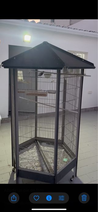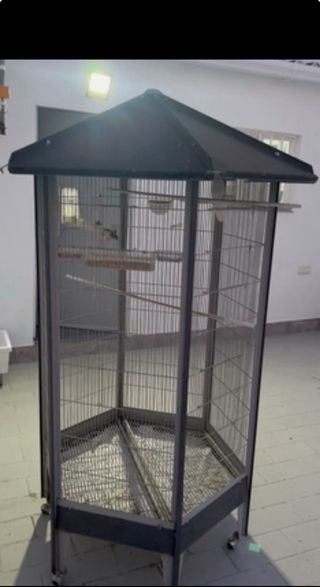 Amplia pajarera con varios niveles y perchas para tus aves. - Estructura metálica resistente. - Techo a dos aguas. - Base con rejilla. - Ruedas para facilitar su movilidad.