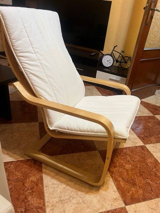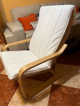 Cómodo sillón Poäng de Ikea, con un diseño moderno y ergonómico. - Estructura de madera curvada. - Cojines de tela acolchada. - Color blanco y madera natural.