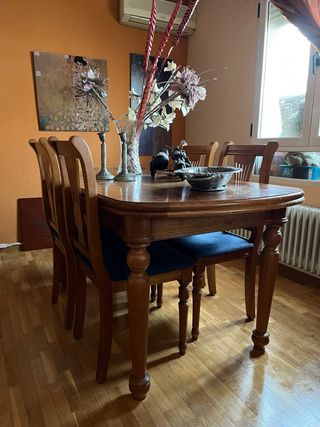 Conjunto de mesa de comedor con cuatro sillas. - Mesa de madera con patas torneadas. - Sillas con asiento tapizado en tela azul. -Tablero de 110cm para expandir la mesa hasta 2,65m Medidas: 155cm largo, 90cm ancho,80cm de altura