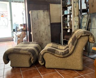 Antiguo conjunto de sillón y puff reposapies, la butaca mide 75 x 95 x 75 cm. Consúltanos opciones para el transporte.