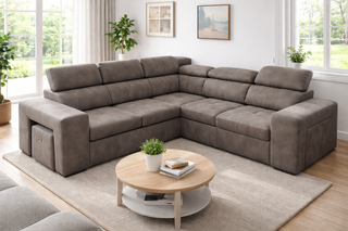 Sofá cama modular marrón con chaiselongue y puff
