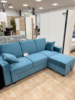 Sofá cama nuevo azul con arcón y puff MODERNO