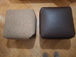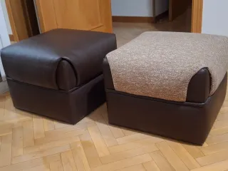 Conjunto de dos puffs, uno en tela beige y otro en polipiel marrón. - Puff de tela con textura. - Puff de polipiel liso.
