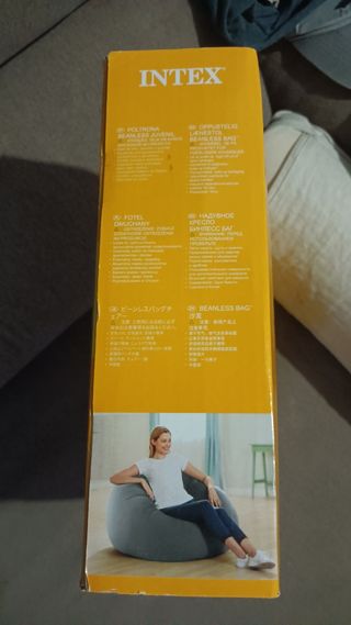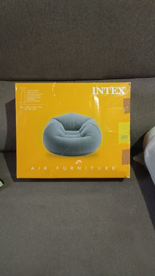 Puff inflable de la marca INTEX, color gris y de tela. Es cómodo y fácil de inflar, en perfecto estado, sólo sacado de la caja, probado y vuelto a guardar, la caja algo desgastada por el movimiento pero el puff está en perfecto estado. - Medidas: 114cm x 114cm x 71cm - Ideal para relajarse y descansar