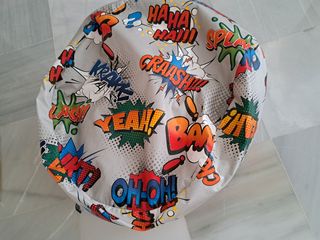 Puff saco de tela con estampado de cómics. Ideal para niños. - Diseño divertido y colorido. - Perfecto para jugar o relajarse. - Se encuentra en buen estado.