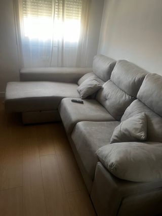 Sofá chaiselongue de 4 plazas en color gris. Está en buen estado y es muy cómodo. Se abre entero. - Incluye arcón. - Se incluyen 2 pufs a juego.