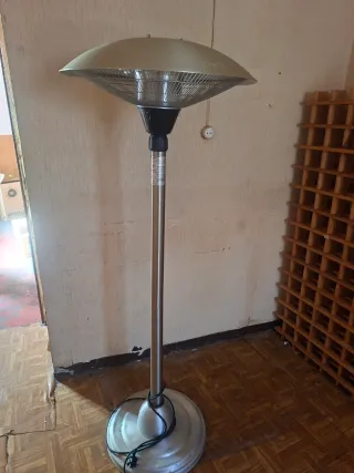 Estufa eléctrica de pie. - Base redonda y estable. - Columna central plateada. - Calentador superior con rejilla protectora.