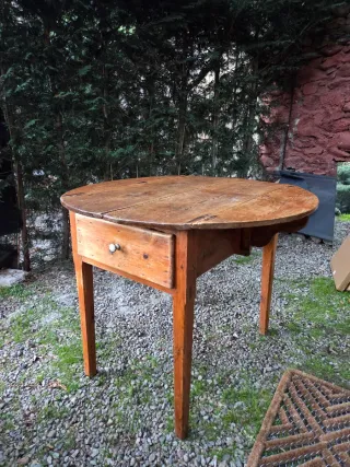 Mesa redonda de madera con un estilo rústico y acabado natural. Su diseño plegable la hace práctica para ocupar menos espacio y dispone de cajon de almacenamiento. Recogida en Ur, al lado de Puigcerda.