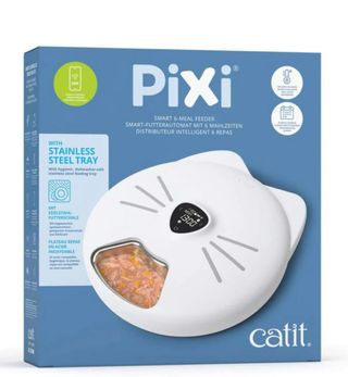 Comedero automático con capacidad para 6 raciones, ideal para mascotas. - Bandeja de acero inoxidable. - Diseño moderno y funcional.