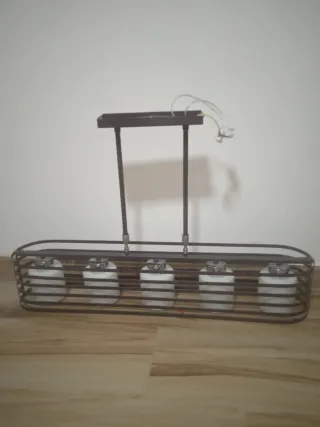 Elegante lámpara colgante para salón o comedor. Su diseño combina líneas modernas con un toque rústico. - Estructura de metal con acabado en tono marrón. - Pantallas cilíndricas de cristal blanco.