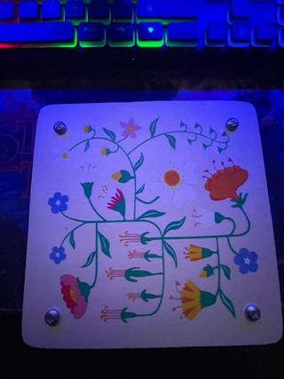 Prensador de flores con un bonito diseño floral. - Diseño con flores y hojas en tonos verdes, rosas, naranjas y amarillos. - Base blanca. - Fijado con tornillos metálicos.