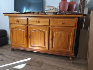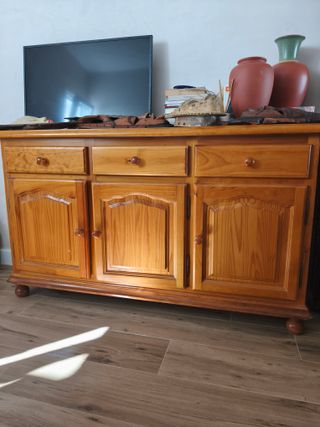 Mueble aparador de comedor con un diseño clásico y elegante. - Tres cajones superiores con tiradores redondos. - Tres puertas inferiores con tiradores a juego. - Patas redondeadas que le dan un toque distintivo.